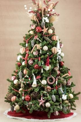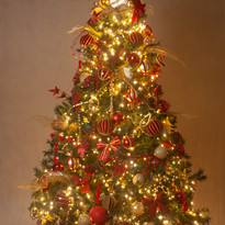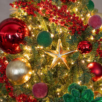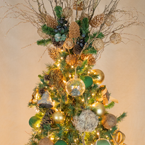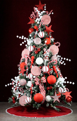 Viste tu árbol con el contraste dinámico del rojo cereza y el verde pino profundo. Esferas brillantes de ambos tonos se alternan con varas de cerezas y flores de terciopelo. Las luces cálidas realzan la decoración, mientras pequeños toques dorados en esferas y estrellas aportan un suave destello. El resultado es un look clásico y acogedor, perfecto para una Navidad llena de color y tradición.